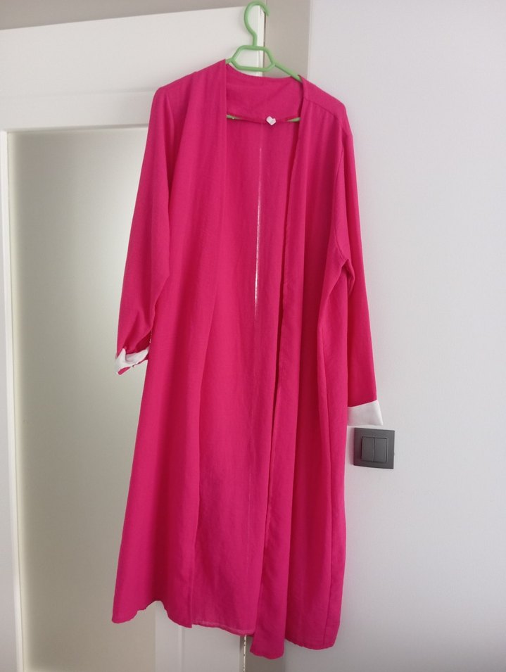 Uzun, salaş kesim kadın sabahlık, uzun kollu ve canlı pembe renkte. Minimalist ve normcore tarzda, desensiz sade bir tasarıma sahip.
