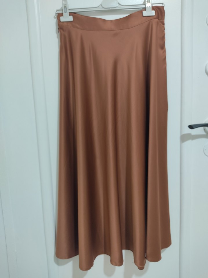 kahve kiremit arası renkte, salaş kesimli, saten parlak kumaştan drapeli etek. 90cm boyda Minimalist ve desensiz tasarımıyla ofis için uygundur. ✨