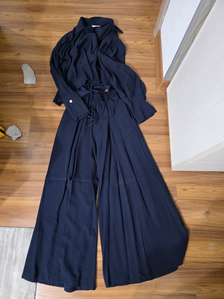 Lacivert uzun tulum, salaş kesim ve drapeli yumuşak kumaşla tasarlanmıştır. Notlu yaka ve askılı kollara sahiptir, minimalist ofis stiline uygundur. ✨
