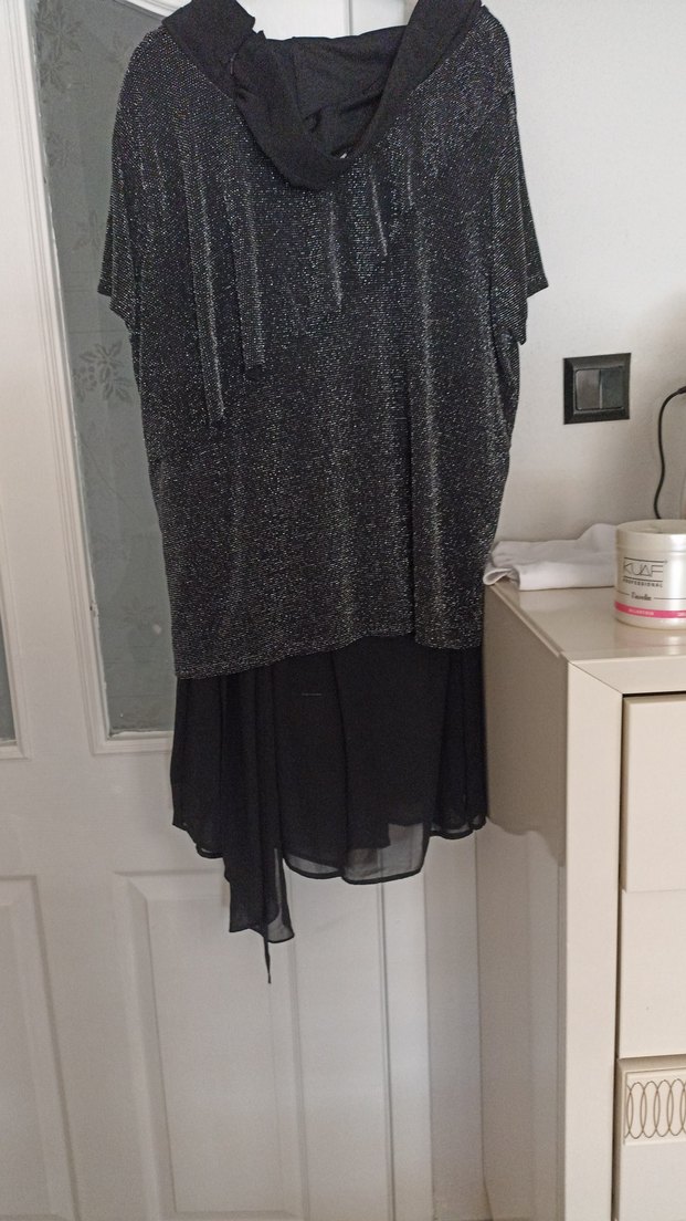 Siyah uzun elbise, salaş kesim ve drapeli tasarıma sahip. Yüksek yakalı ve kolsuz modeliyle avant-garde tarzı ve partiler için uygun. ✨