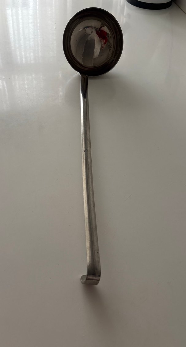 uzun saplı ve derin kaseye sahip metal kepçe, çorba veya sulu yemek servisinde kullanılır. No 5
