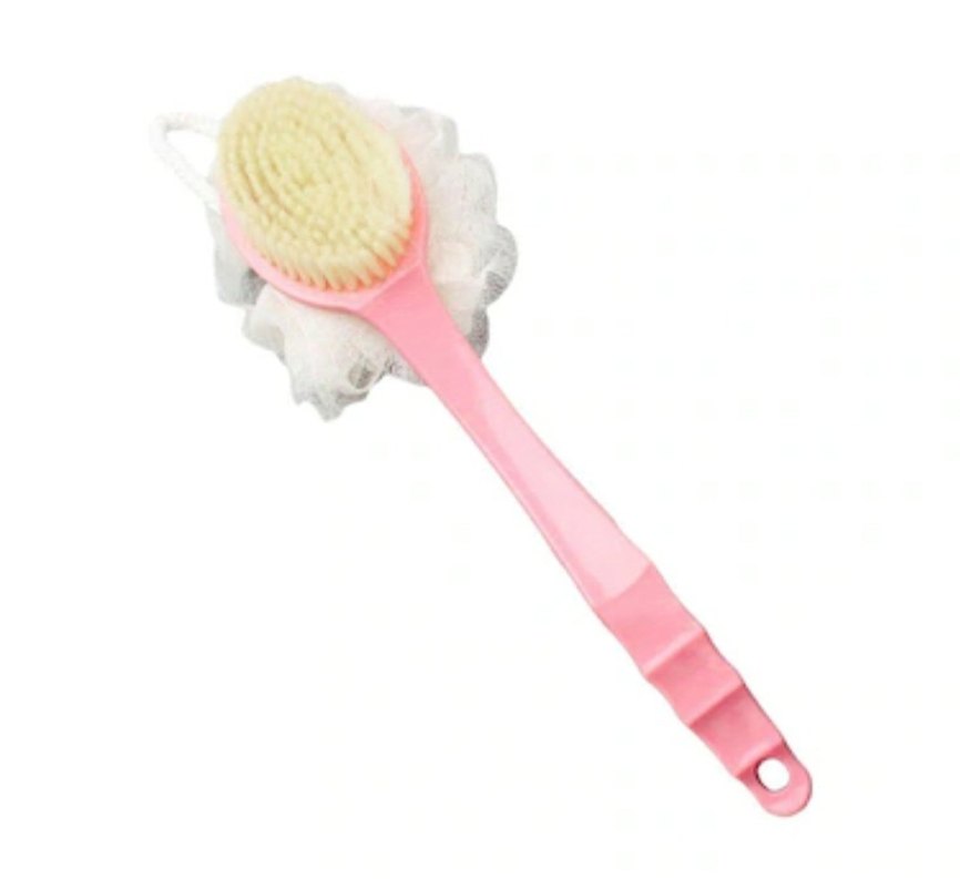 Pastel pembe renkte, uzun saplı banyo süngeri; yumuşak fırça ve file sünger içerir.