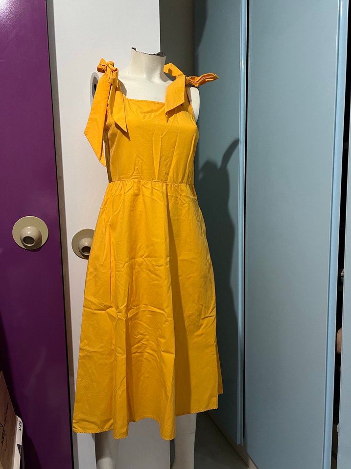 Askılı, uzun sarı elbise, drapeli tasarıma ve bağcıklı askılara sahip. Sentetik kumaştan yapılmış, parlak ve desensiz, günlük kullanıma uygun.