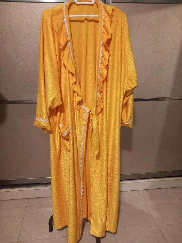 Uzun kollu, bol kesim sarı sabahlık, bağcıklı ve volanlı detaylarla bohem tarzda, parlak batik desenlidir.