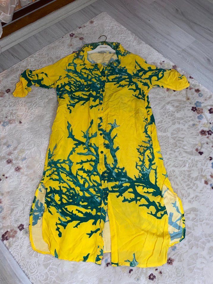 Uzun Sarı Bağlama Desenli Bohem Kadın Elbisesi M beden