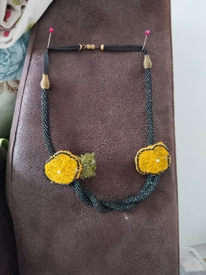 Uzun, koyu renkli boncuklardan oluşan ve sarı nakışlı çiçek desenlerine sahip bohem tarzda kadın kolye.
