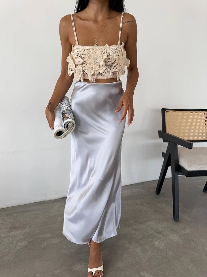 beyaz uzun saten etek, bol kesimi ve ipeksi dokusuyla bohem tarzı yansıtıyor, düğünler için uygun.