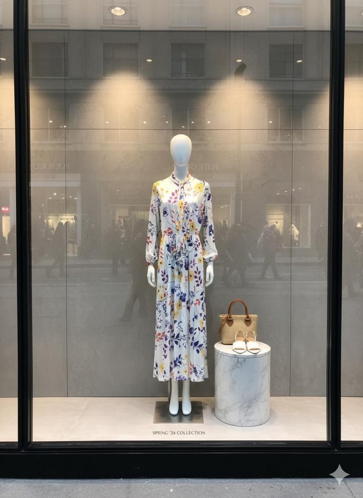 Yüksek yakalı, uzun kollu, bol kesim beyaz elbise. Şeffaf kumaş ve batik desenleriyle çağdaş ve minimal bir tarz sunar.
