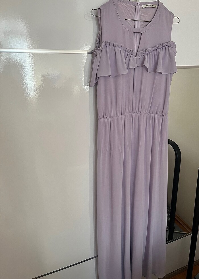 Lila renginde şifon uzun her yeri kapalı sadece kolları tül yarım kol oluyor o şekilde çok şık herkesin kınasında nişanında düğününde giyilebilecek zamansız elbise sadece 1 kez giyildi perspektive markasına ait
