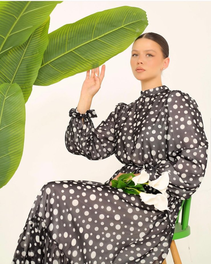 Melike tatar Uzun şifon Puantiyeli lacivert gri