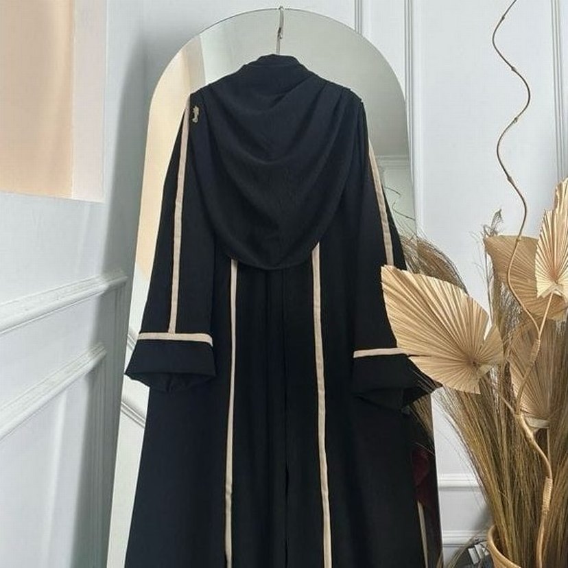 Uzun siyah abaya Sentetik kumaştan üretilmiş, düz kesim ve uzun kolludur.