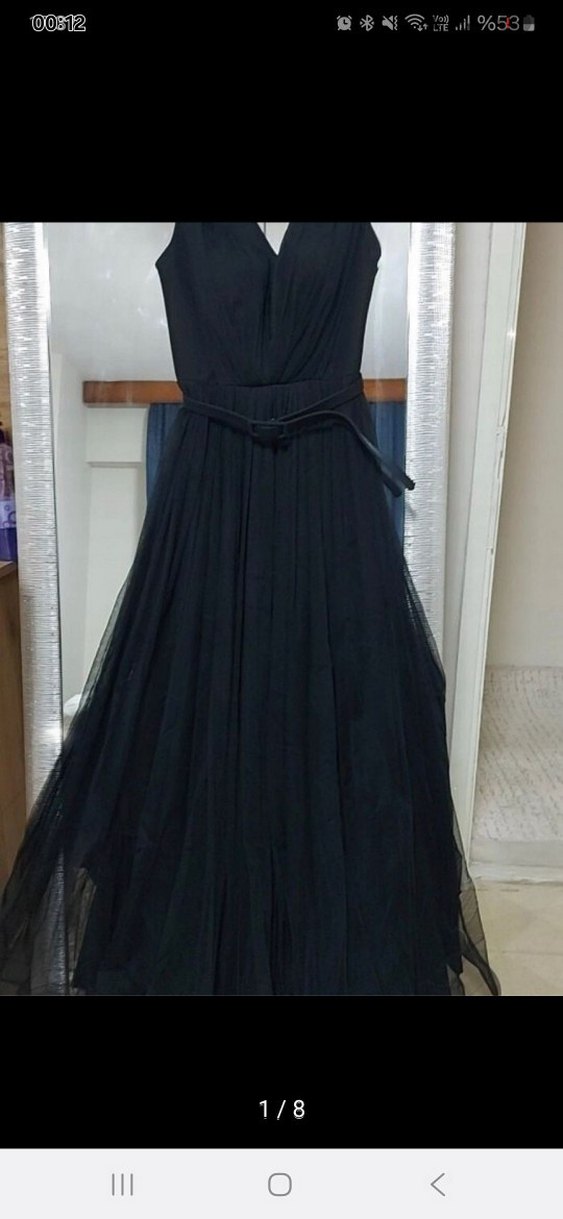 Uzun siyah abiye, V yakalı ve askılı, Sentetik kumaştan, drapeli detaylı ve kemerli.şık bir tasarımı var Severek giyinildi