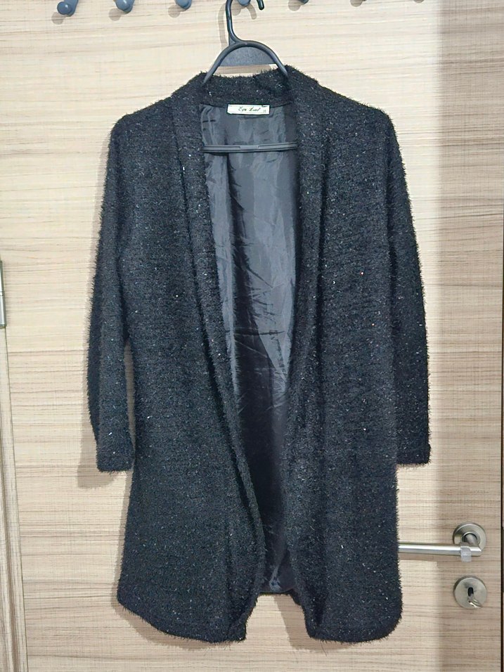 Uzun Siyah Astarlı Simli Kadın Hırka