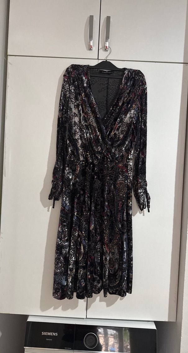 Bu uzun kollu gotik elbise, bol kesim, drapeli tasarım ve koyu çok renkli batik desen içerir.Kadifemsi kumaştan, V yakalı ve parti için uygundur. İç elbisesi de var resimlerde mevcut Boy 113 cm#İki koltuk arası 54 cm #Likralı#