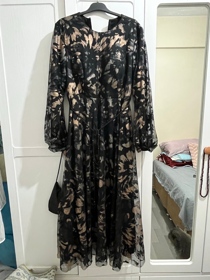 Siyah batik desenli, bol kesim ve kemerli uzun elbise. Sentetik kumaştan, uzun kollu ve askısız yakalı, şık bir tasarım.