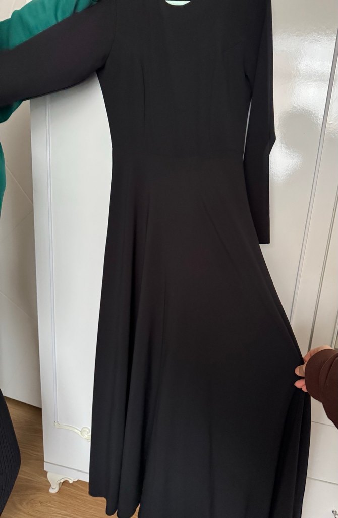 1 kez giyildi 38 beden, uzun kollu, drapeli ve dar kesim siyah elbise.Bele tam oturan belden aşağı genişçe açılan elbise sade ve şık.Düz ve sentetik kumaştan,özel günler için uygun.