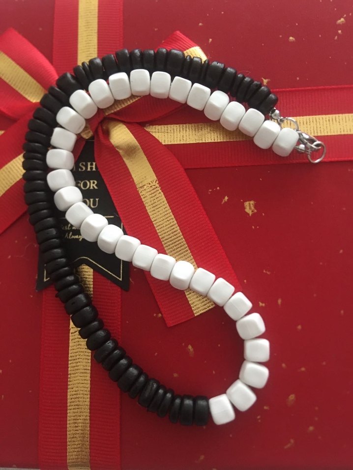Uzun siyah ve beyaz boncuklardan oluşan kolye, avant-garde ve spor tarzlara uygun, dikkat çekici bir aksesuar. Metal kapamalı. Hindistan cevizi kabuğu boncuk kolye 45 cm ölcüsü