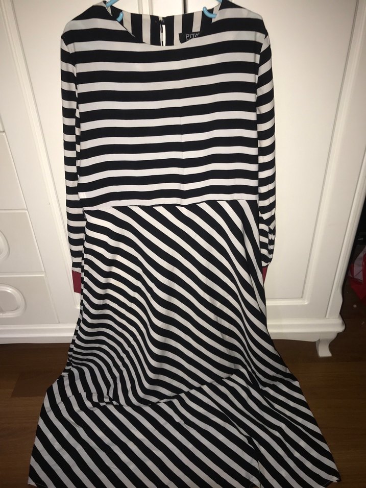 Uzun siyah-beyaz çizgili elbise, drapeli kesim ve uzun kollu. Sentetik kumaştan, bol kesim ve tekne yaka ile günlük kullanıma uygun.