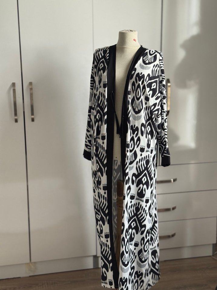 Uzun, bol kesim siyah beyaz desenli kimono, yakalı ve uzun kolludur. Kemerle ayarlanabilir, sentetik kumaştandır. Günlük kullanıma uygundur.