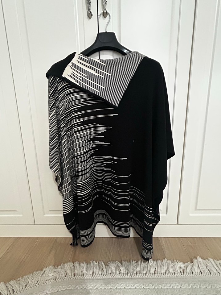 Kadınlar için uzun, dökümlü ve bol kesim panço. Uzun kollu ve kayık yaka, siyah ve gri desenli, sentetik kumaştan üretilmiştir. Günlük kullanım için uygundur. 46-50 bedene kadar uyumlu