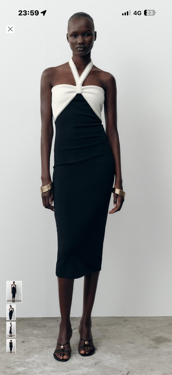 Bu uzun, siyah-beyaz drapeli straplez elbise, ince kesimi ve ipeksi kumaşıyla çağdaş ve avangart bir stile sahiptir. Ofis için uygundur. ✨