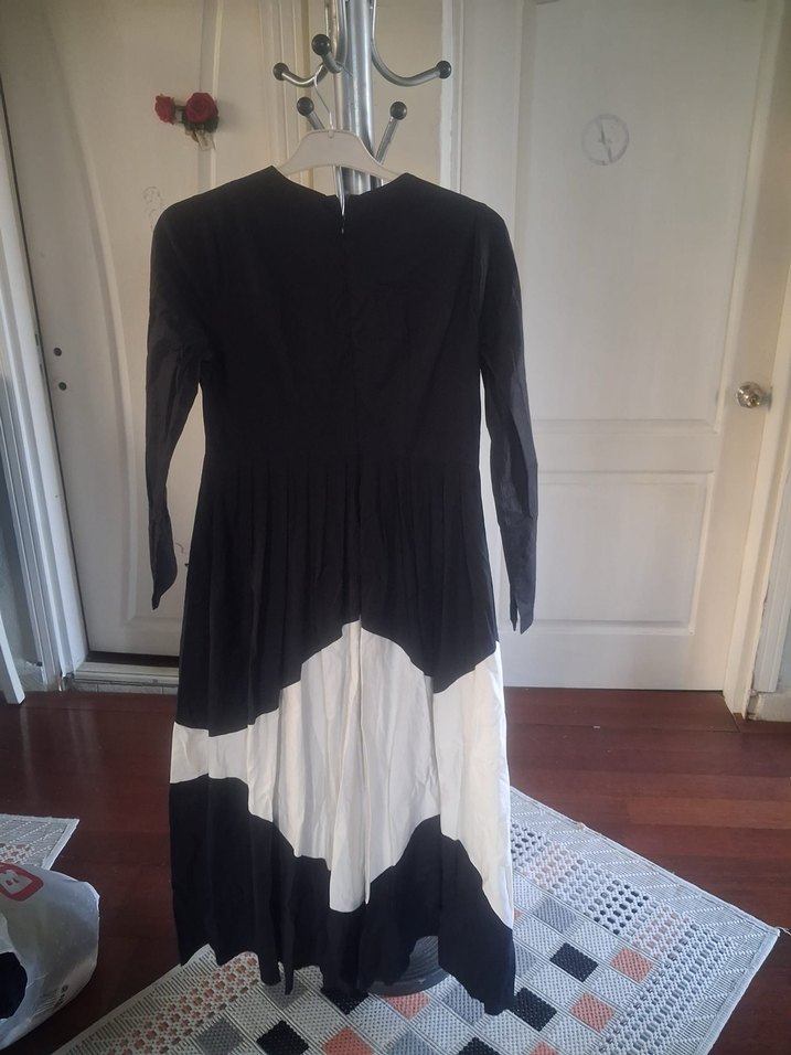 V yaka ve uzun kollu, keten kumaştan siyah beyaz uzun elbise. Salaş kesim ve pile detaylarıyla gotik ve Paris tarzını birleştirir.