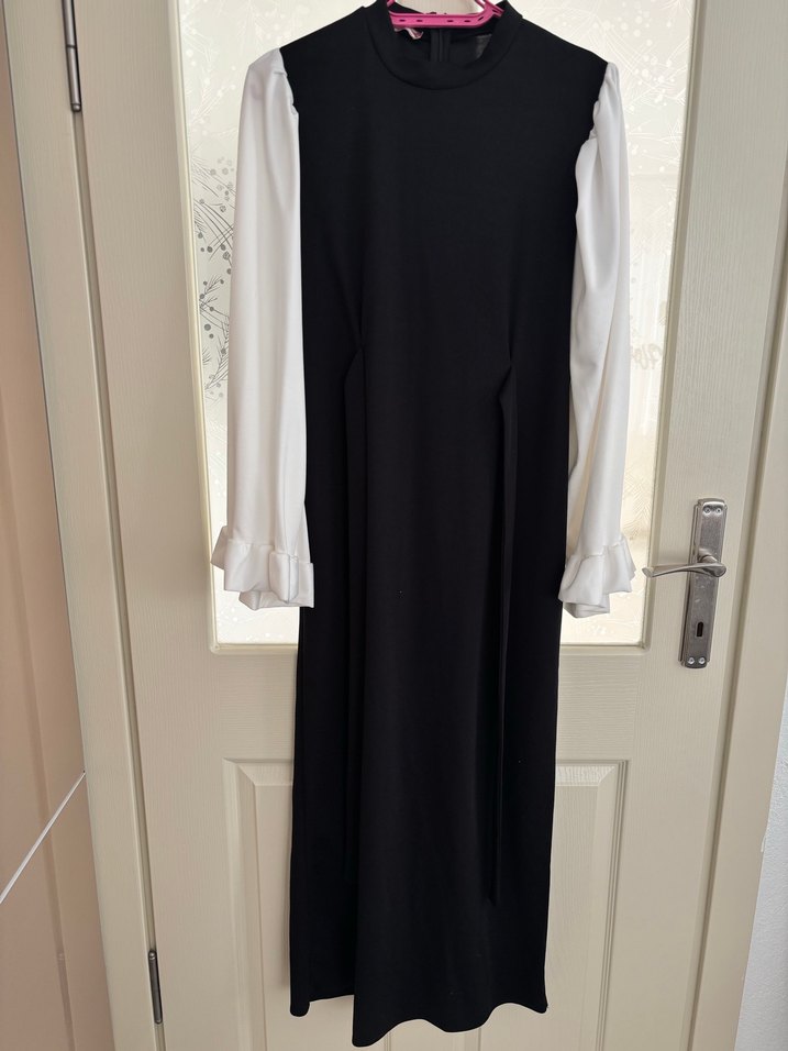 Uzun siyah elbise, beyaz uzun kollu ve fırfırlı manşet detaylıdır. Yüksek yakalı, drapeli ve regular fit modeldir. Ofis için uygundur.