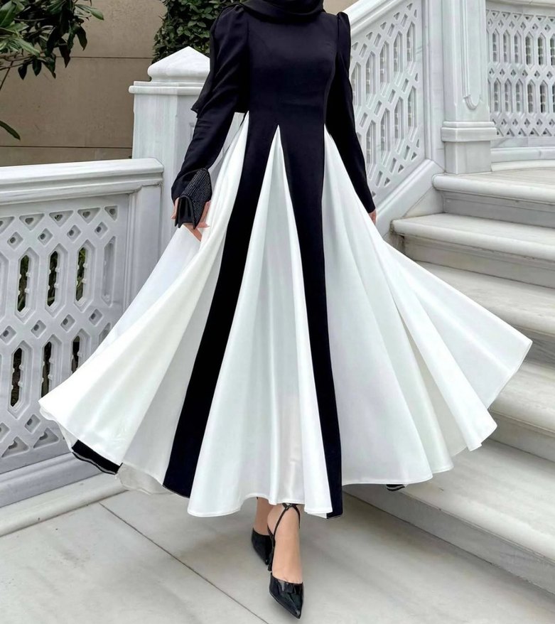 Uzun kollu, siyah ve beyaz panelli pilili kadın elbisesi. Teknolojik sentetik kumaştan, kayık yaka ve regular kesimle ofis için uygun.1 bedendir 38 40 bedene uyumludur sadece 2 defa giyildi sorunsuzdur.