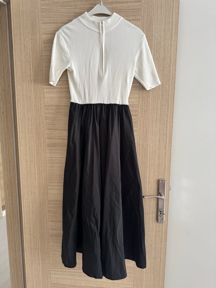 Beyaz kısa kollu, bisiklet yaka üst kısmı ve siyah piliseli etek kısmıyla uzun, bol kesim elbise, sokak modası ve Paris tarzını bir araya getiriyor.