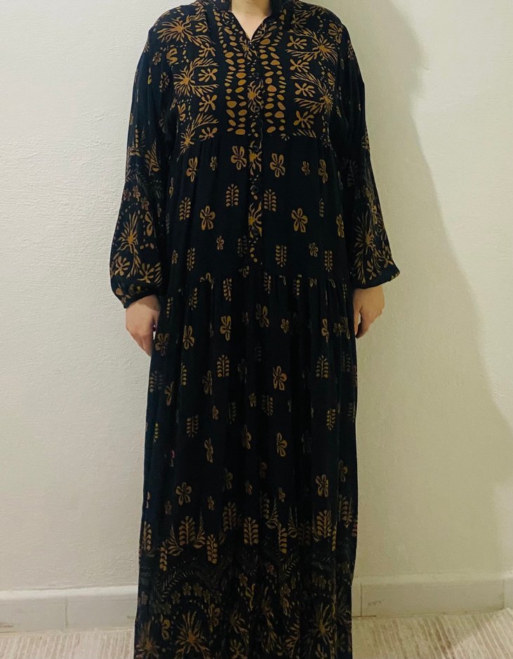 Uzun siyah renkli, bol kesim, yüksek yakalı ve uzun kollu bohem desenli , penye kumaş 1/68 boya uygun,