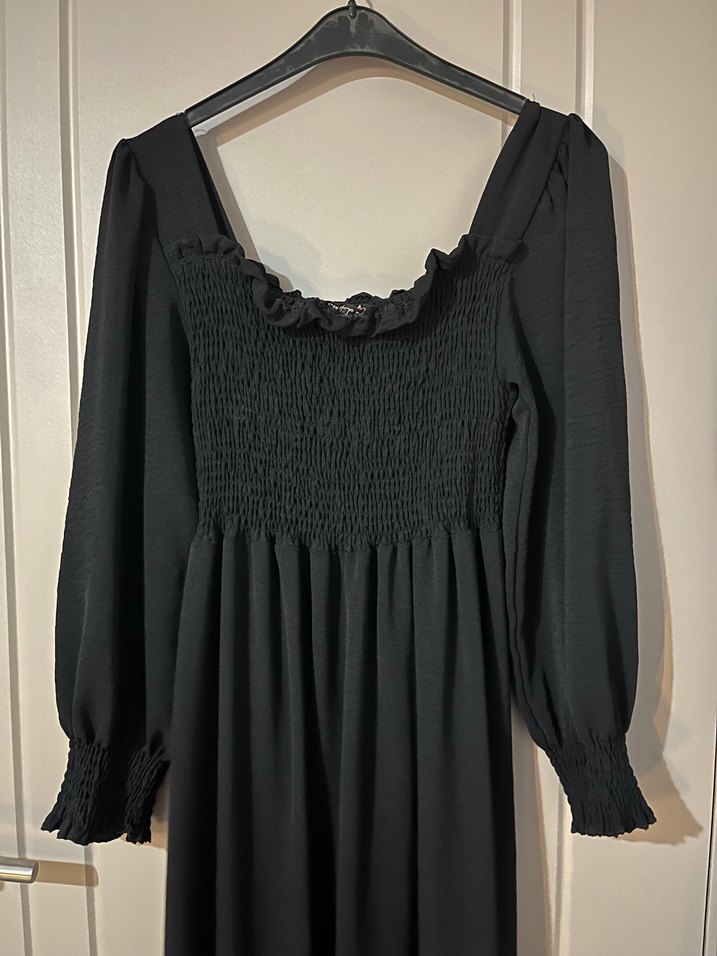 Yumuşak keten kumaştan, bol kesim uzun siyah elbise. Kayık yaka ve volan detaylı, uzun kolları manşetli. Romantik akşamlar için uygun.