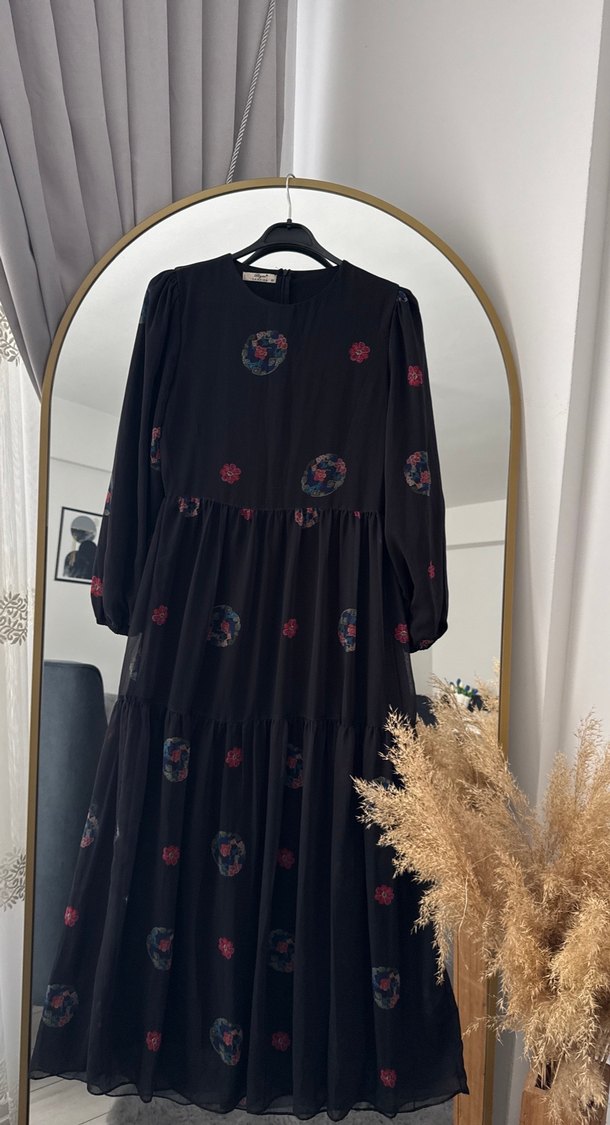Uzun siyah elbise, bol kesim, uzun kollu ve yuvarlak yaka detaylıdır. Sentetik kumaştan üretilmiş, batik desenli ve fırfır detaylarıyla bohem tarzını yansıtır.