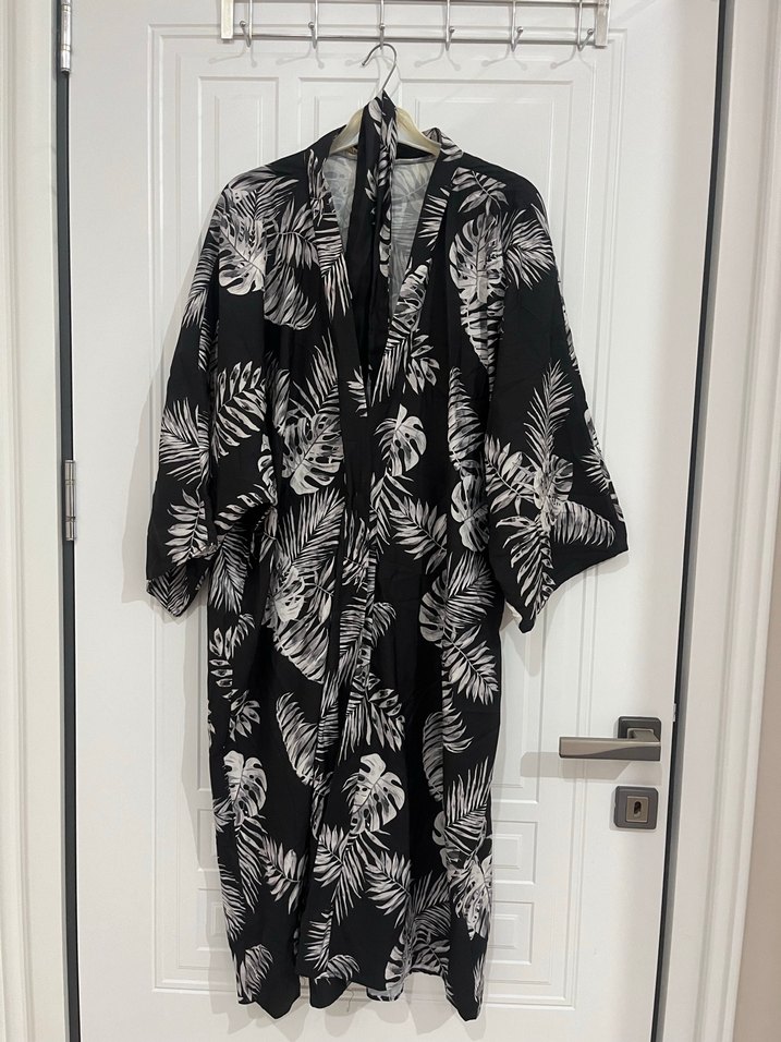 Uzun siyah kimono, bol kesim ve dökümlü uzun kollara sahip. Yumuşak sentetik kumaştan, beyaz tropikal yaprak desenli, günlük kullanıma uygun bohem tarzda. Marka temsilidir. Ufak ip çekilmesi şeklinde olan fotoğraflar en sonda.38-46 beden uyumlu