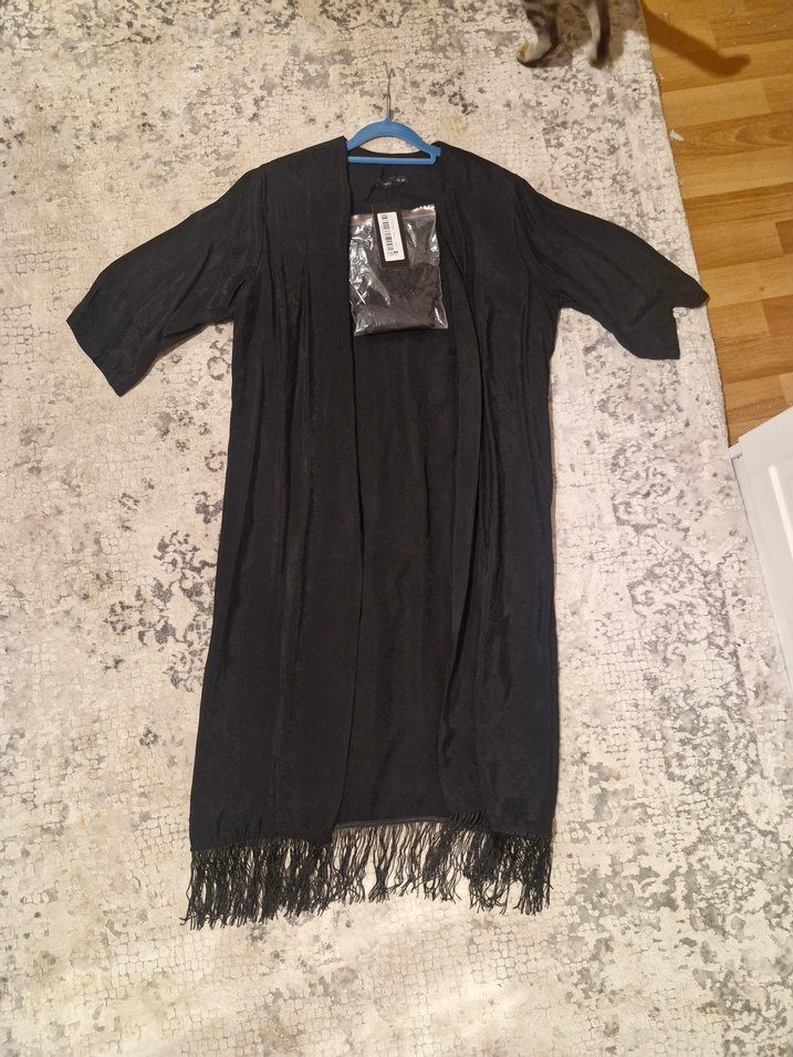 Uzun, siyah, bol kesim bohem kadın kimono, ipeksi kumaştan, baskılı desenli ve saçaklı etek uçlu, uzun kollu ve yaka detaylıdır. sabahlık