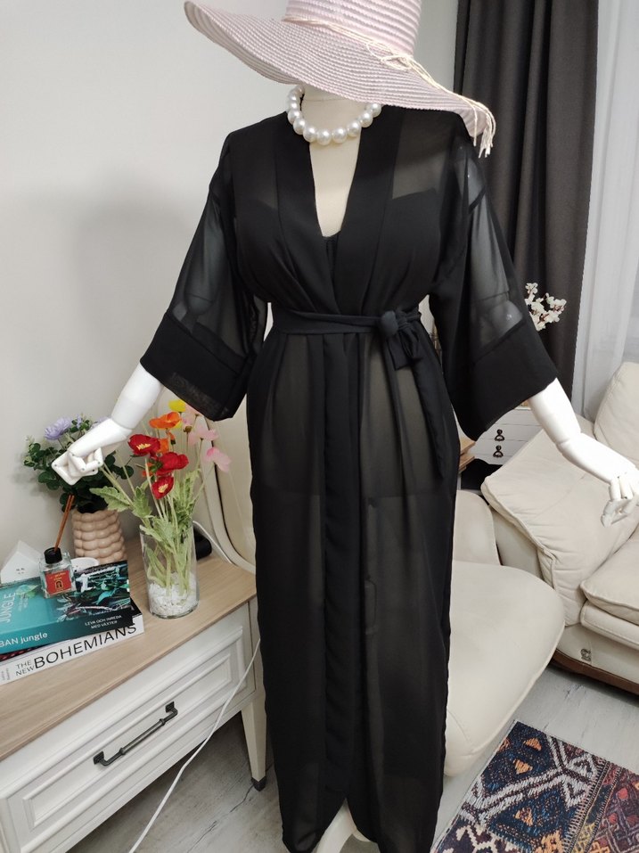 Uzun siyah ipeksi kumaştan, bol kesim ve drapeli, V yaka, askılı kollu, hafif çiçek desenli gotik bohem kadın kimono.