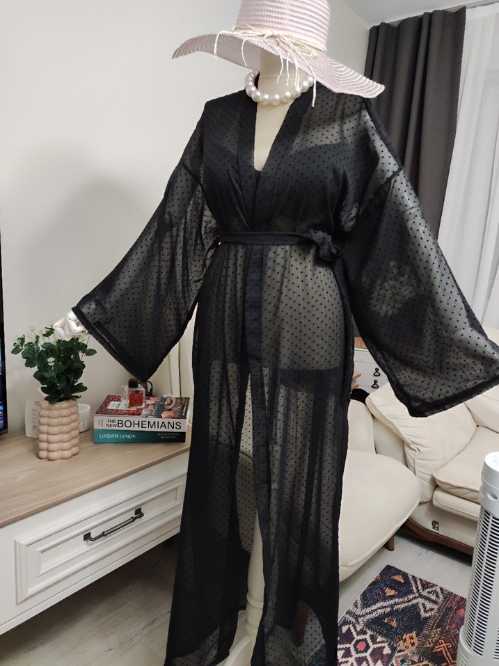 Uzun siyah bohem kadın kimono, bol kesim, drapeli kollar ve V yaka ile. Hafif sentetik kumaştan, nakışlı desenli ve askılı kollu, şık gotik tarz için uygun.