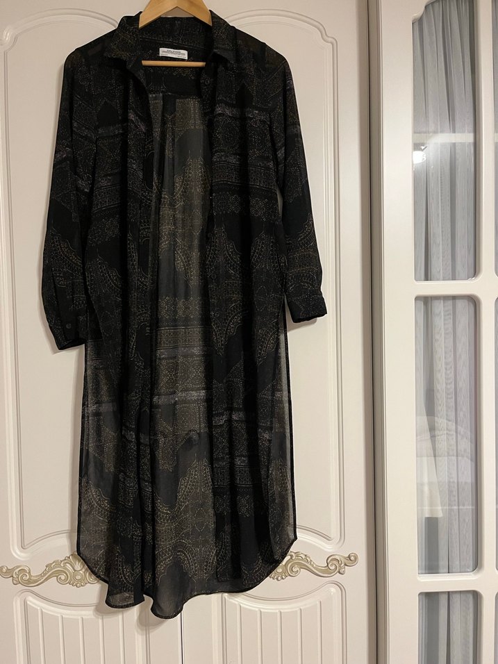 Uzun, bol kesim kadın tunik, Yumuşak sentetik kumaştan, siyah karanlık bağlama desenlidir, günlük kullanıma uygundur.