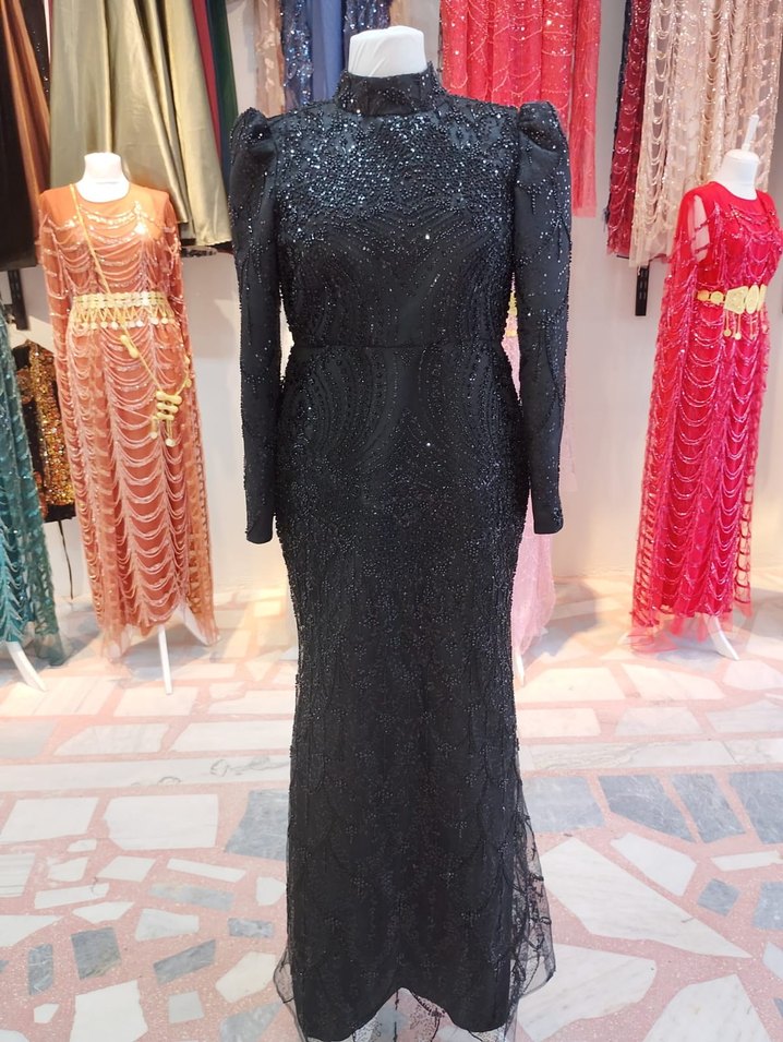 Uzun Siyah Boncuk İşlemeli Abiye Elbise 3 beden 38,40,42