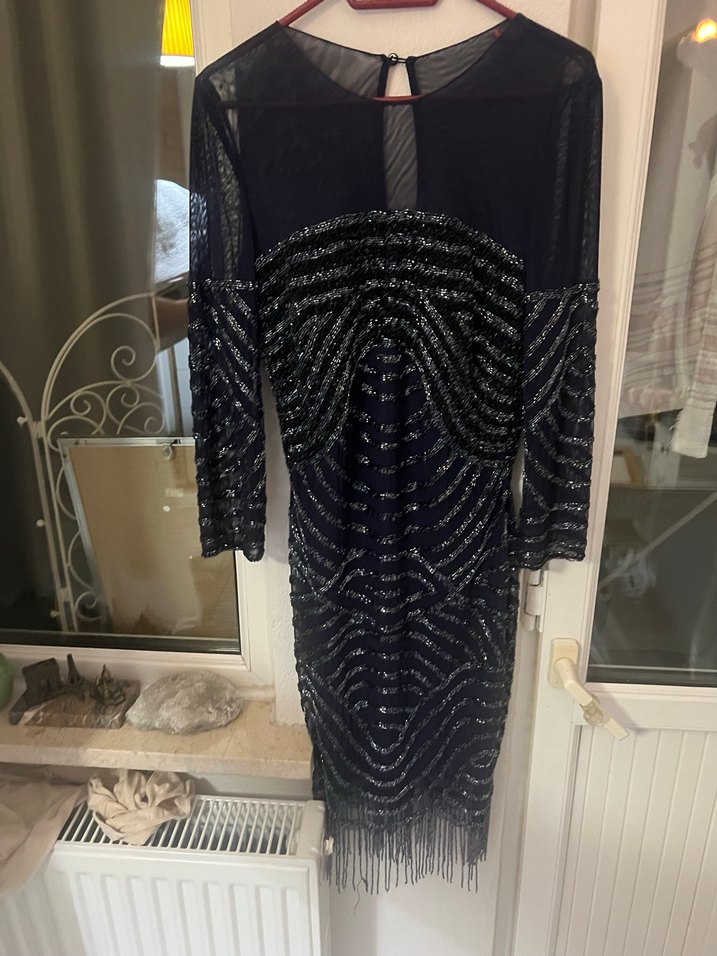 V yaka ve askılı kolları olan, boncuk işlemeli uzun siyah abiye elbise. İnce kesimi ve karanlık, göz alıcı tarzıyla parti için uygun.