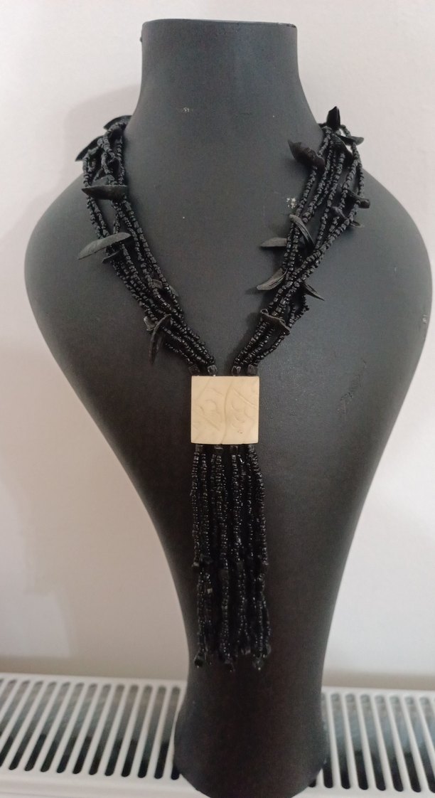 Uzun siyah boncuklu, işlemeli desenli ve kare kolye ucu olan bohem ve avangart tarzda kadın kolyesi. ✨