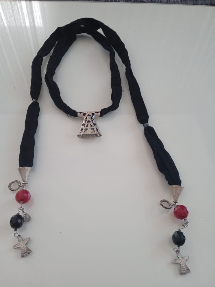 Uzun siyah boncuklu, renkli işlemeli detaylara sahip bohem ve gotik tarzda günlük kullanıma uygun kolye.
