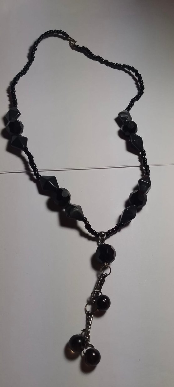 Uzun siyah boncuklardan oluşan, gotik tarzda desen içermeyen kadın kolyesi, günlük kullanıma uygun.