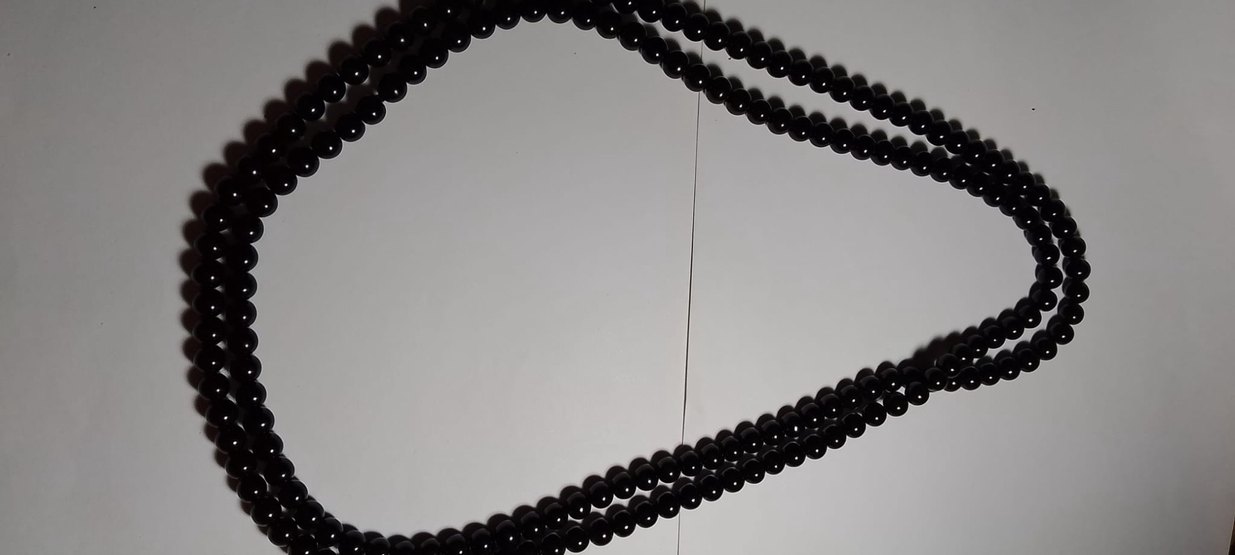 Uzun siyah boncuklu kolye, minimalist gotik tarzıyla partiler ve modaya uygun görünümler için uygundur. Koyu tonu, avangart ve trendsetter kişiliklere hitap eder.
