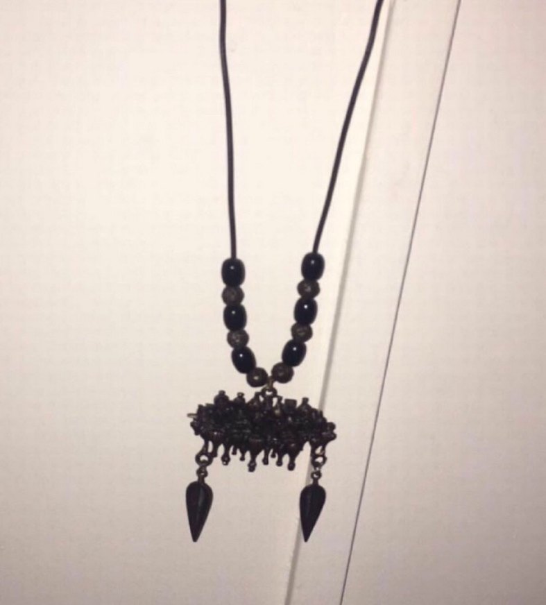 Uzun siyah kolye, boncuklu detaylar ve işlemeli desenlerle gotik ve bohem tarzı yansıtıyor. Romantik akşamlar için uygun.
