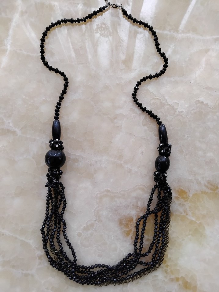 Uzun siyah boncuklardan oluşan, desenli gotik tarzda, bohem ve retro dokunuşlar taşıyan kolye. Günlük kullanıma uygundur.