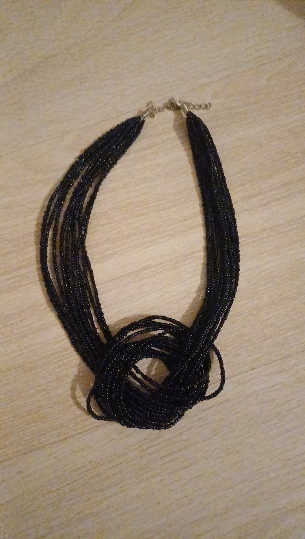 Uzun siyah boncuklardan oluşan çoklu iplikli kolye, gotik ve bohem tarzda, günlük kullanıma uygun.