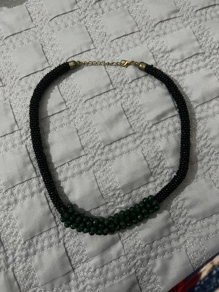 Uzun siyah boncuklu kolye, koyu yılan desenli, minimal ve goth tarzına uygun, bohem dokunuşlu, günlük kullanıma uygun.
