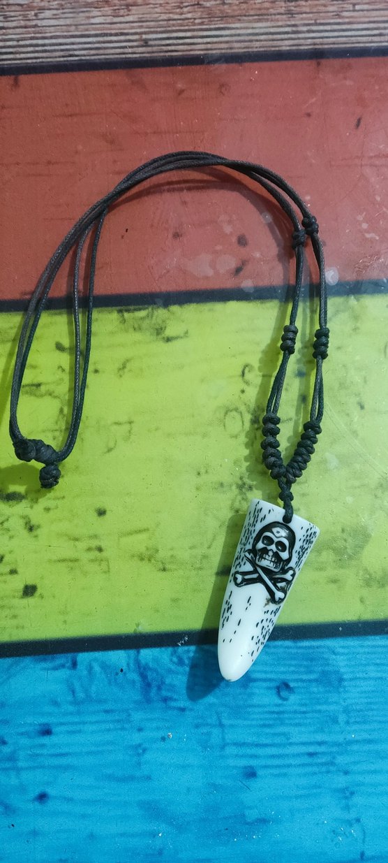 Uzun siyah boncuklu kolye, kafatası figürlü uç ile renkli tie-dye ve grunge punk tarzını yansıtır, açık hava kullanımı için uygundur.