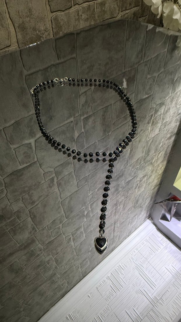 Uzun siyah boncuklardan oluşan, yılan desenli ve kalp uçlu gotik tarza uygun kolye.