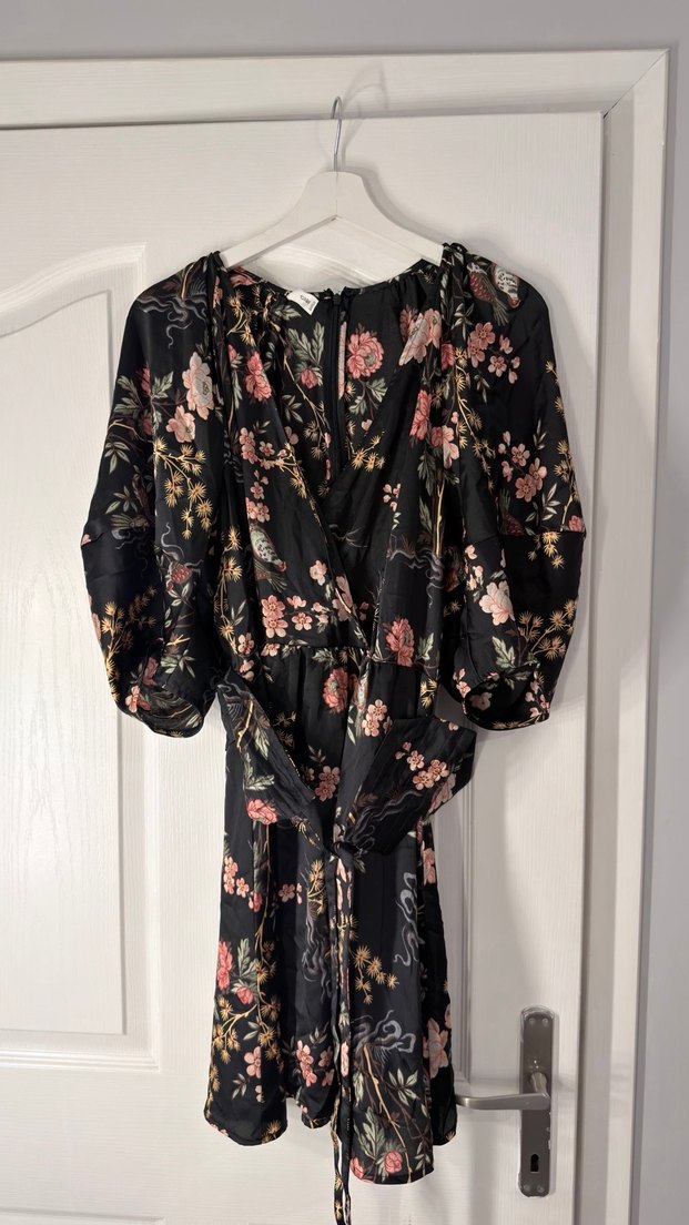 Mango bir kere giyildi Uzun, bol kesim siyah elbise, çiçek desenli, V yaka ve askılı kolludur. Drapeli tasarımı bohem tarzı yansıtır, romantik akşamlar için uygundur.